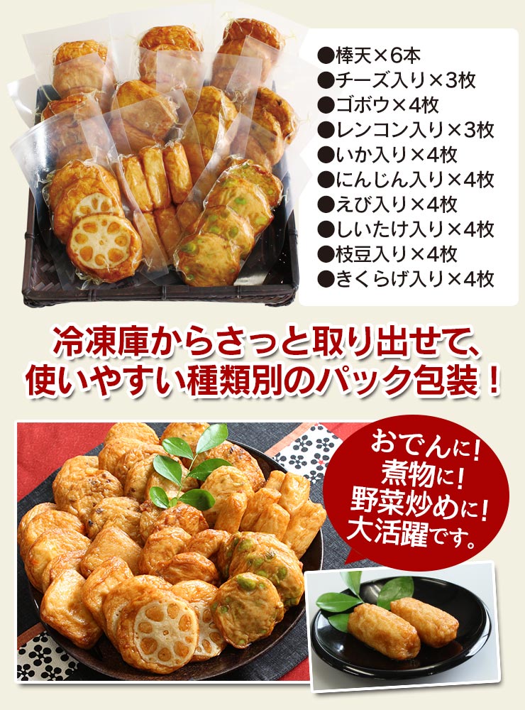 ●内容 ・棒天さつまあげ×6枚 ・チーズ入りさつまあげ×3枚 ・ゴボウさつまあげ×4枚 ・レンコン入りさつまあげ×3枚 ・いか入りさつまあげ×4枚 ・にんじん入りさつまあげ×4枚 ・えび入りさつまあげ×4枚 ・しいたけ入りさつまあげ×4枚 ・枝豆入りさつまあげ×4枚 ・きくらげ入りさつまあげ×4枚 (合計10種類) ●送料: ○北海道・本州・四国・九州/送料1250円(クール代込) ○沖縄県・一部離島など/1,900円(クール代込) ●おおしま屋発送(冷凍便)鹿児島県 名物 の さつま揚げ を ボリューム たっぷりな 詰合わせ に! ギフト 内祝い から お弁当 の おかず まで重宝すること間違いなし!! 本場の味 をぜひ!